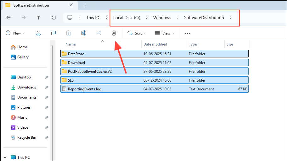 Vaihe 2:Siirtyä jhkC:WindowsSoftwareDistributionja poista kaikki tiedostot ja kansiot sisällä. Tämä poistaa vanhat päivitysvälimuistitiedostot, jotka voivat estää uusia asennuksia.