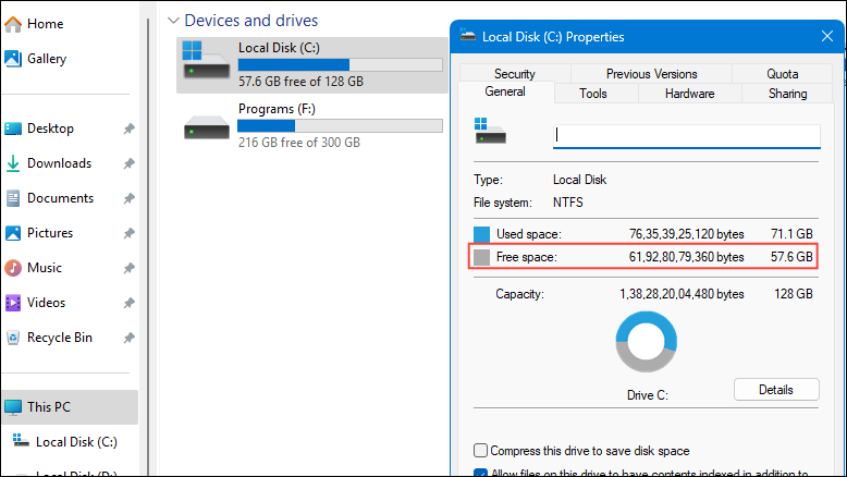 Vaihe 1:Windows 11 -päivitykset vaativat riittävästi ilmaista levytilaa järjestelmän asemassa (c :). AvataTiedostotutkija, napsauta hiiren kakkospainikkeella C: Aja ja valitseOminaisuudetVarmistaa käytettävissä oleva tila. Microsoft suosittelee vähintään 20 Gt ilmaista, mutta päivityksiin voidaan tarvita enemmän.