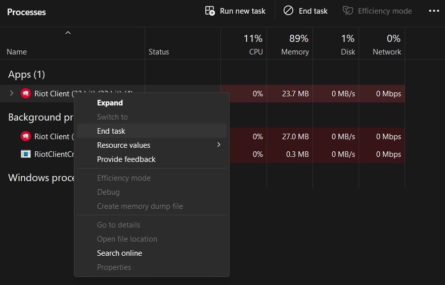 Kun käyttäjät kohtaavat Valorant -virhekoodin Van 81, heidän tulisi yrittää käynnistää mellakka -asiakas uudelleen. On mahdollista, että mellakka -asiakas ei toimi kunnolla, minkä vuoksi ongelma tapahtuu järjestelmässäsi. Sinun on yksinkertaisesti suljettava mellakka -asiakas ja suljettava se sitten. Voit myös tehdä sen tehtävähallinnan avulla. Olemme luetelleet vaiheet tämän tekemiseksi.