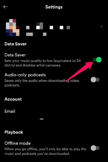 - Kun olet kytkettynä tiedonsäästötilan päälle, Spotify asettaa musiikin laadun alhaiseen.