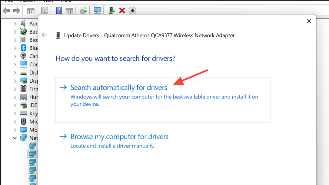 Vaihe 3:LaajentaaNetwork Adapters, napsauta hiiren kakkospainikkeella aktiivista verkkosovitinta ja valitseUpdate driver. ValitaSearch automatically for driversTai asenna viimeisin ohjain manuaalisesti laitteistovalmistajan verkkosivustolta. Vanhentuneet tai vioittuneet kuljettajat aiheuttavat Windowsin usein väärän verkon tilaa.