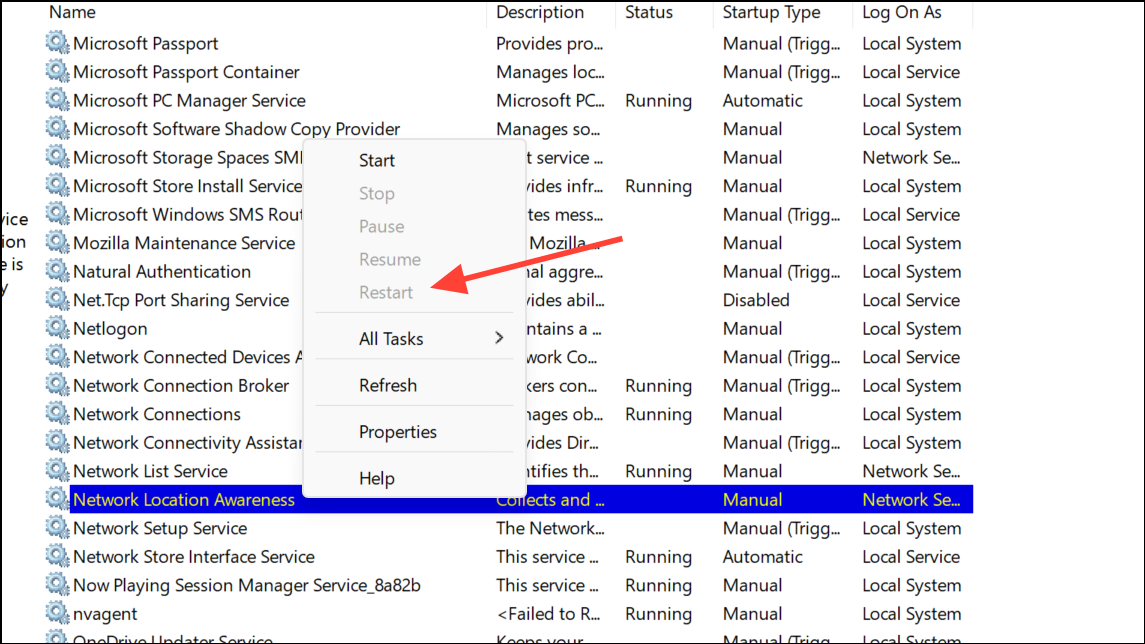 Vaihe 2:Löydä palveluikkunastaNetwork Location AwarenessjaDHCP Client. Napsauta hiiren kakkospainikkeella kutakin ja valitseRestart.