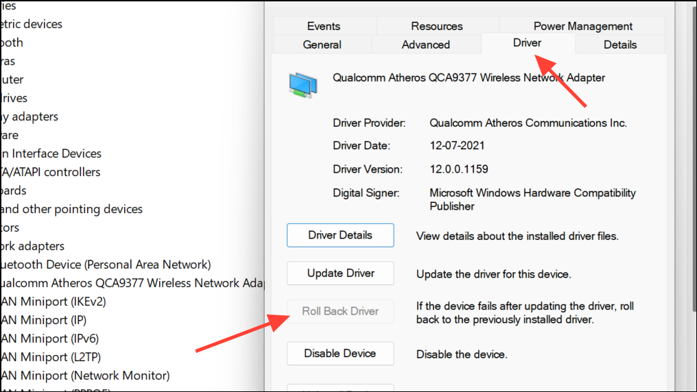 Vaihe 2:Jos ongelma alkoi äskettäisen ohjaimen päivityksen jälkeen, napsauta hiiren kakkospainikkeella sovitinta, valitseProperties, meneDriverja käytä ja käytäRoll Back DriverJos saatavilla.