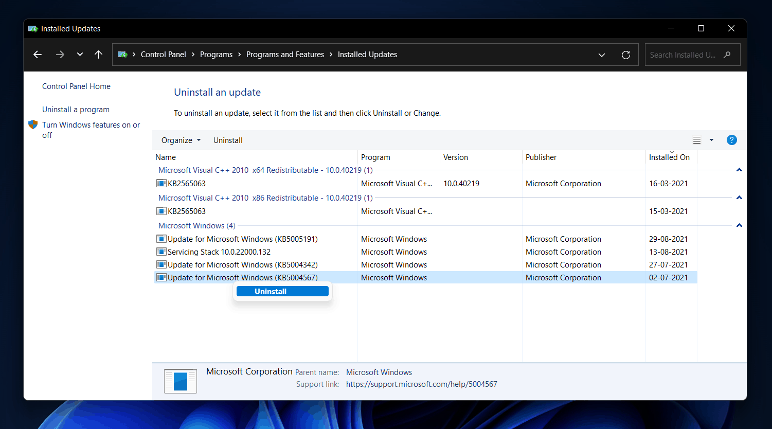 - Löydä äskettäinen päivitys, joka aiheutti ongelman ja napsauta asennuksen.