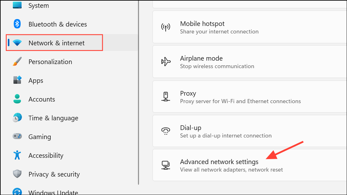Vaihe 1:Mennä jhkSettings→Network & Internet→Advanced network settings.