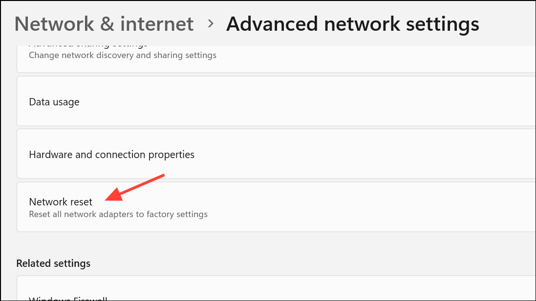 Vaihe 3:NapsauttaaNetwork reset. Tämä poistaa ja asentaa kaikki verkkosovittimet ja palauttaa verkkokomponentit oletusasetuksiinsa.