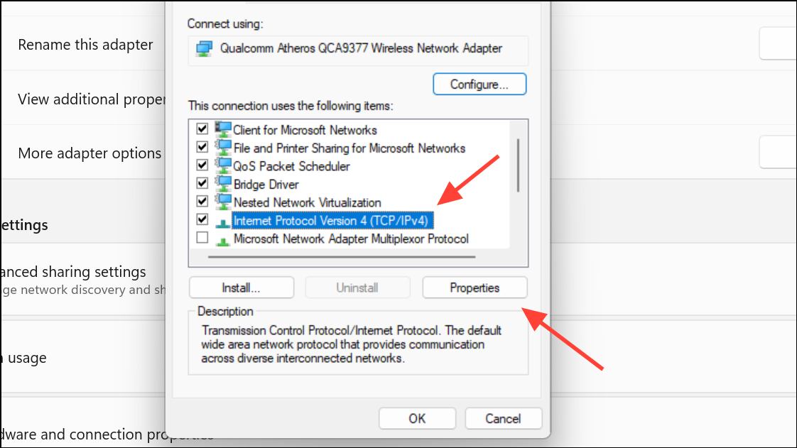 Vaihe 3:Tämä avaaPropertiesValintaikkuna. ValitaInternet Protocol Version 4 (TCP/IPv4)ja napsautaPropertiesuudelleen.