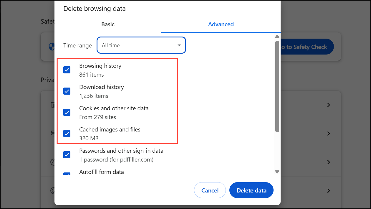 Vaihe 3:NapsauttaaDelete data. Käynnistä selain uudelleen ja testaa virhe.