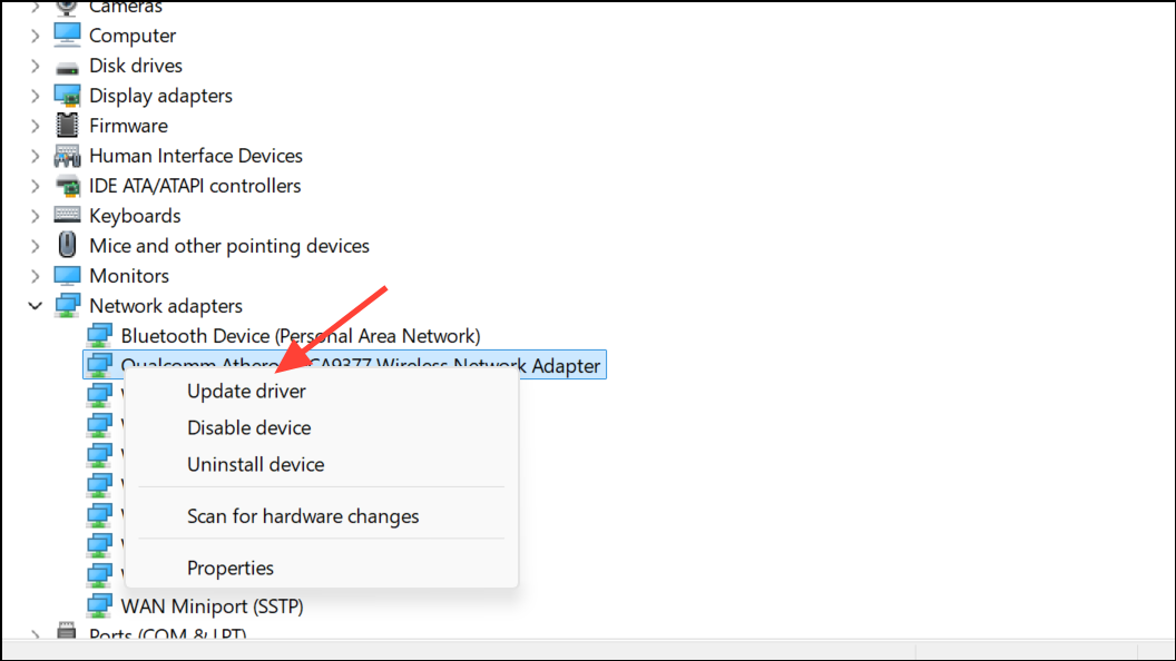 Vaihe 2:LaajentaaNetwork adapters, napsauta hiiren kakkospainikkeella ensisijaista sovitinta ja valitseUpdate driver. ValitaSearch automatically for drivers. Jos päivitystä ei löydy, voit poistaa ohjaimen ja käynnistää tietokoneen uudelleen pakottaaksesi Windowsin asentamaan sen uudelleen.
