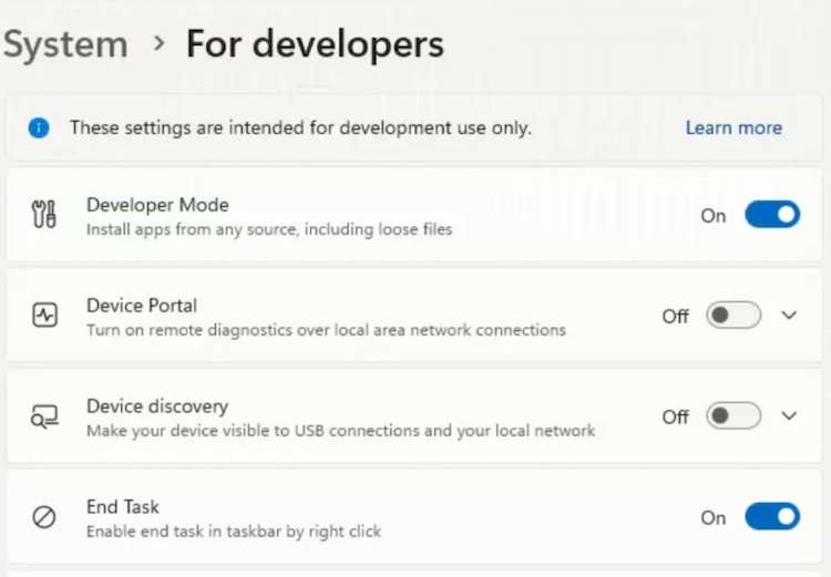 Kun olet päivittänyt Windows 11 -ohjelmistosi, sinun on otettava käyttöön lopputehtävä ominaisuus. Siirry Asetukset -valikkoon. Siirry järjestelmään ja siirry kehittäjille. Vieritä alas päätehtäväksi ja vaihda se päälle.