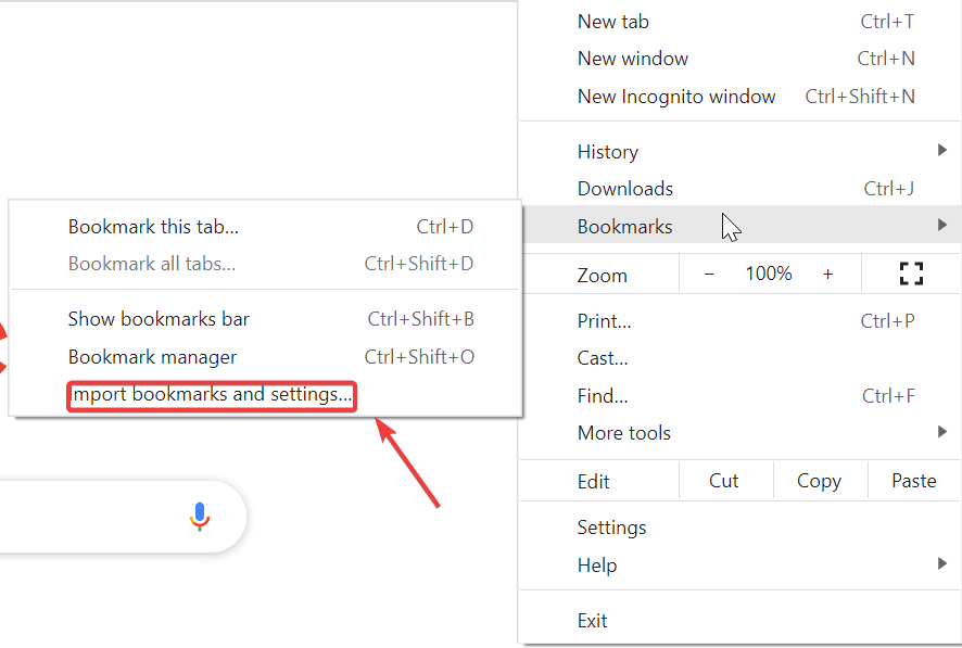 3. NapsautaKirjanmerkkivaihtoehto jaTuo kirjanmerkit ja asetuksetvaihtoehto.