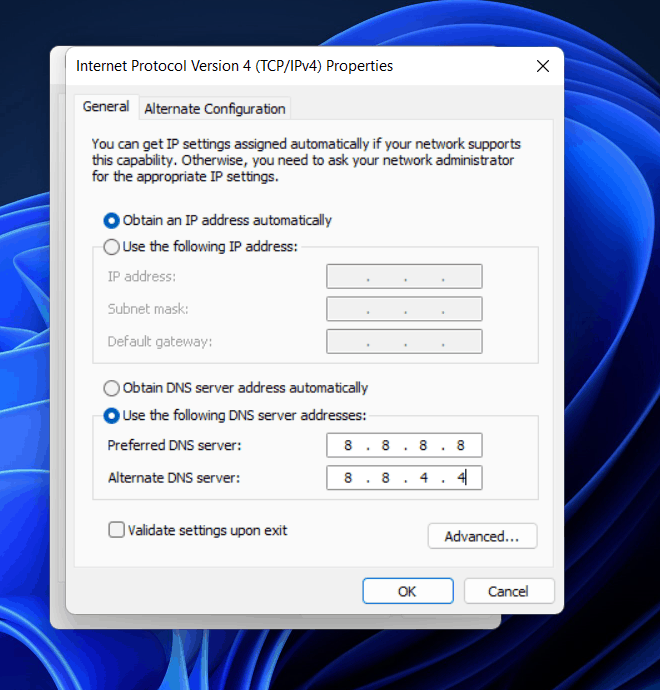 - Aseta nytEnsisijainen DNS -palvelinkun8.8.8.8ja asetaVaihtoehtoinen DNS -palvelinkun8.8.4.4ja napsauta sittenOK.