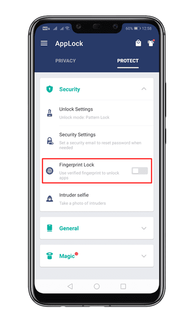 5. Jos haluat sormenjälkien suojausta, ota käyttöönSormenjälkivaihtoehto.
