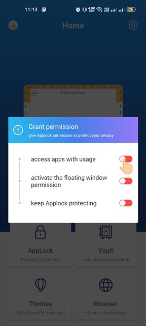 5. sovellus pyytää sinuaapurahat. Myöntäkää lupa asetussovelluksen lukitsemiseen.
