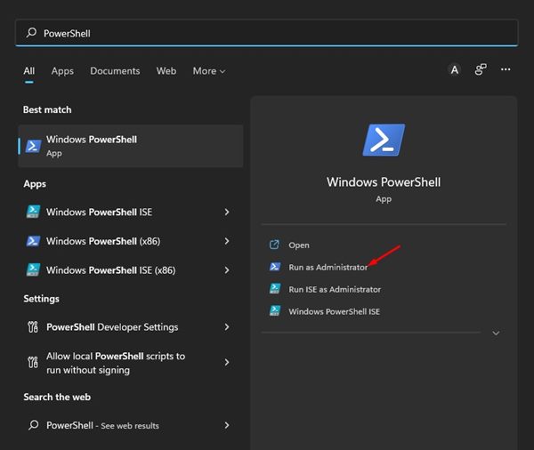 1. Napsauta Windows 11 -hakua ja kirjoita PowerShell. Napsauta hiiren kakkospainikkeella jtkPowershellja valitseJärjestelmänvalvojana.