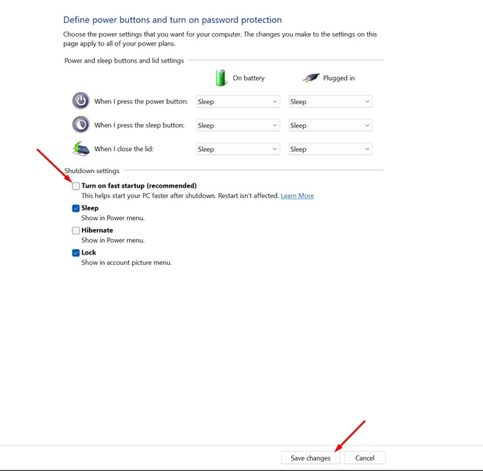 5.Panna tarkistamaanseKytke nopea käynnistys (suositeltu)Vaihtoehto ja napsautaTallenna muutokset.