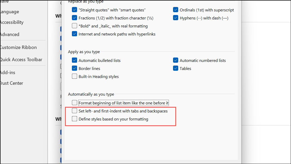 Näiden ominaisuuksien sammuttaminen estää sanan tekemästä automaattisia muutoksia, jotka vaikuttavat marginaaleihin tai kohdistukseen.