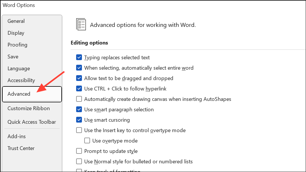 Vaihe 1:Ennen tulostamista tai tallentamista PDF: ksi, siirryTiedosto-Vaihtoehdot-Edistynyt.