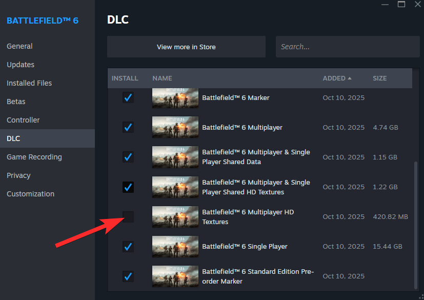 - Siirry DLC -välilehteen, jossa kaikki pelikomponentit on lueteltu.