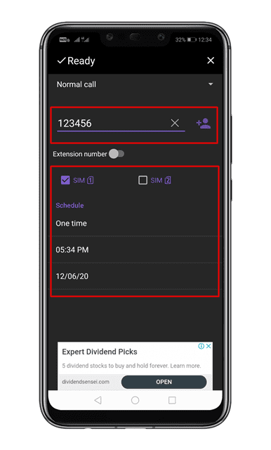 7. Kirjoita numero ja aseta aika ja päivämääräAjoittaa. Kun olet valmis, napautaValmisPainike ajoittaa puhelut.