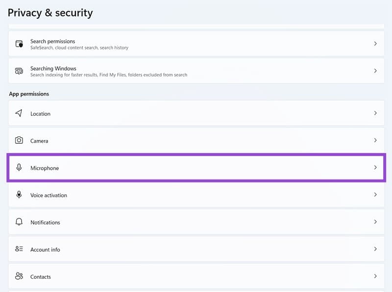Vaihe 3.Etsi ja napsauta ”mikrofoni” -vaihtoehtoa. Näet luettelon kaikista sovelluksista, jotka voivat käyttää mikrofonia. Voit myös vaihtaa nämä käyttöoikeudet haluamallasi tavalla.