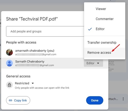 Jos et halua käyttäjän käyttävän tiedostoa, sinun on poistettava kyseinen käyttäjä Google Drive -valikosta. Näin voidaan peruuttaa jonkun käyttöoikeudet Google Drivessa.