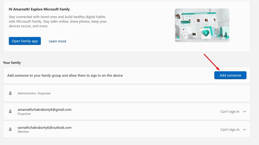 3. Napsauta perhe- ja muilla käyttäjillä Hallitse Family -asetuksia verkossa tai poista tili. Tai muuten, käy tälläverkkosivusto. Jos käytät Windows 11: n uusimpia rakennuksia, avaaPerheen turvallisuussovellus.