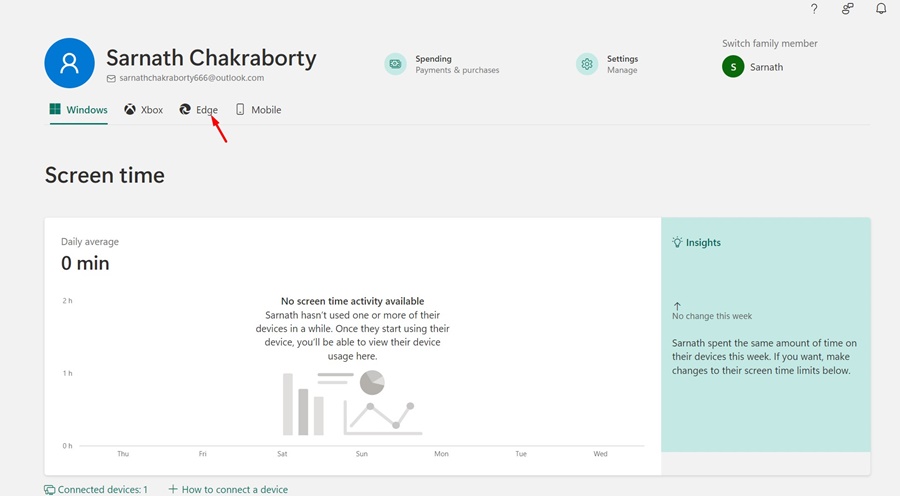 Nyt kun olet kirjautunut perheen turvallisuustilille, voit määrittää vanhempien ohjausvaihtoehdot. Varmista, että lapsesi tili on kytketty laitteeseen.