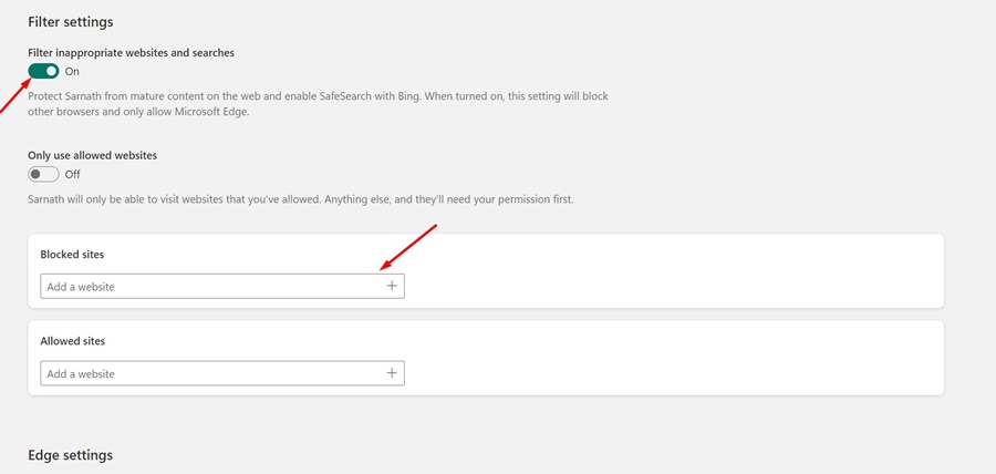 5. Näytösajan asettamisen jälkeen voit siirtyäSisältösuodattimet (reuna)osa. Sisällönsuodatus toimii vain, jos lapsesi käyttää Edge -selainta.
