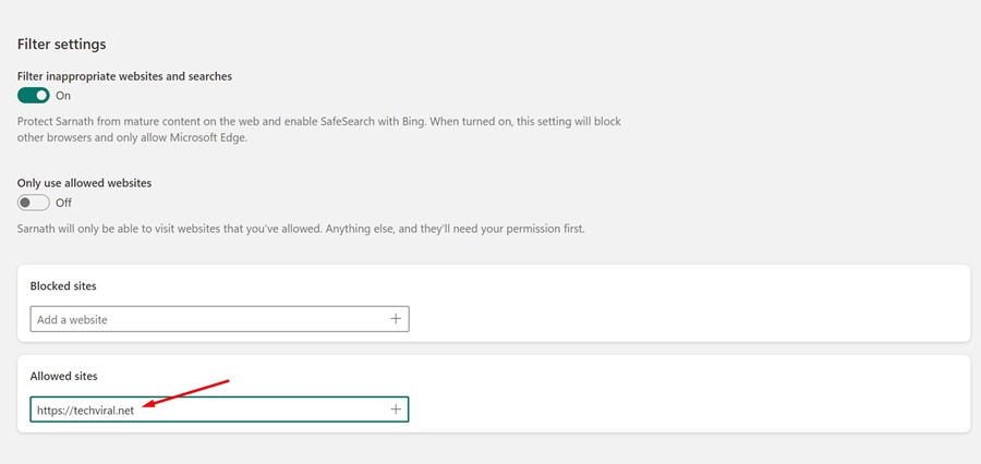 6. Sisältösuodatinosassa voit rajoittaa, mihin verkkosivustoihin ja sovelluksiin lapsesi voivat käyttää. Voit ottaa vaihtoon käyttöönSuodata sopimattomat verkkosivustot ja haut. Jos et halua lapsesi käyvän tietyllä verkkosivustolla, kirjoita URL -osoite vain estettyjen sivustojen luetteloon.