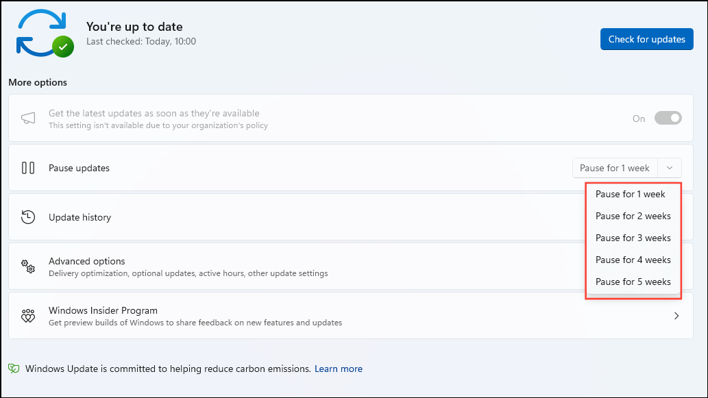 Päivitysten keskeyttäminen on väliaikainen toimenpide. Kun taukojakso päättyy, Windows jatkaa päivitysten kehotusta. Käytä tätä vaihtoehtoa, kun tarvitset lyhytaikaista hallintaa päivityksen ajoituksesta.