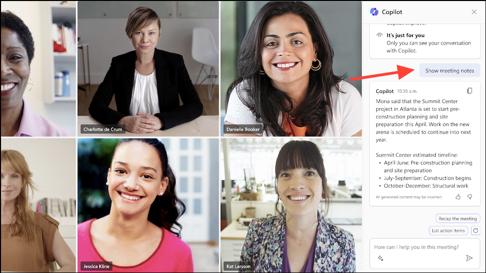 Recap the meeting so far,List any action itemstaiShow meeting notesCopilot -paneelissa ja odota AI -avustajan vastaamista.