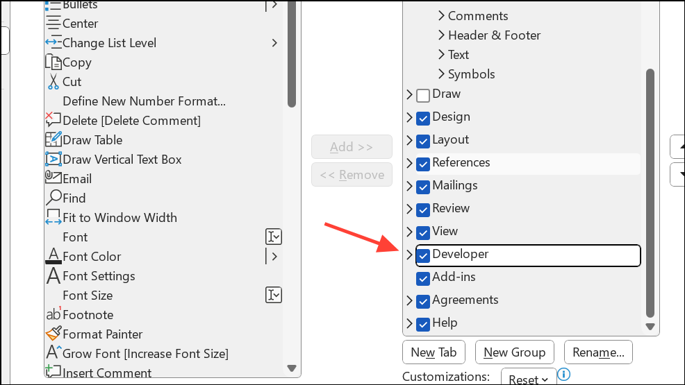 Vaihe 1:Ota kehittäjä-välilehti Wordissa napsauttamalla nauhaa hiiren kakkospainikkeella valitsemallaCustomize the Ribbonja tarkistaminenDeveloper.