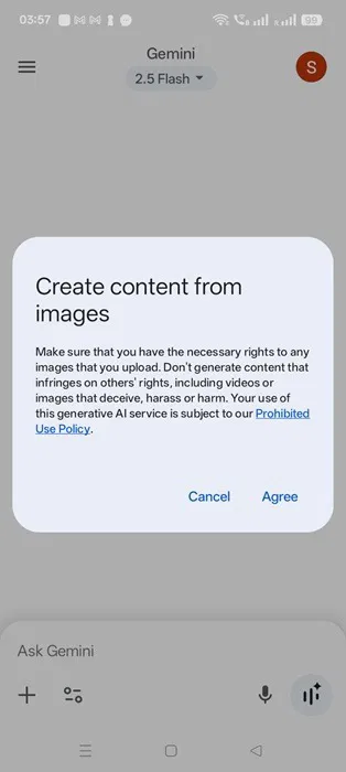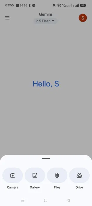 Kirjaudu sisään Gmail-tililläsi laitteesi Google Gemini -sovellukseen. Jos olet poistanut Geminin käytöstä aiemmin, sinun on otettava se käyttöön uudelleen. Varmista, että käytössäsi on oletustila,Gemini 2.5 Flash, käytössä.