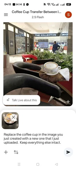 Voit käyttää peräkkäisiä kuvan muokkauksia, kuten korvata luodun kuvan uudella elementillä, kuten uudella kahvikupilla.