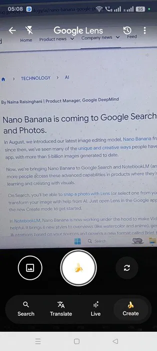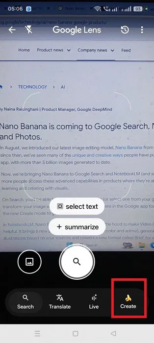 Siirry Google-hakusovellukseen mobiililaitteellasi. NapsautaGoogle Lenstekstivaihtoehto käynnistääksesi kamerasi tutussa Google Lens -tilassa. Sinun pitäisi nähdä näkyvä banaanikuvake merkittynäLuoda.