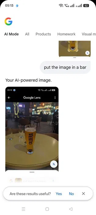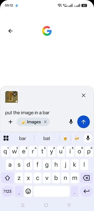 Siirryt automaattisesti Google-haun AI-tilaan. Tee haluamasi muutokset ladattuihin kuviin. Tässä esimerkissä kirjoitan kehotteen "laita kuva palkkiin" testatakseni sovelluksen multimodaalista suunnittelukykyä.