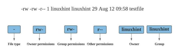 Lähtössä ensimmäinen merkki nimeää merkintätyypin, jossa “-” seisoo “tiedosto” ja “D” "hakemistoon". Sitten on kolme sarjaa yhdeksän merkkiä, joista kolme ensimmäistä edustavat tiedostojen omistajan käyttöoikeuksia, joista toinen kolme merkitsee ryhmäoikeuksia ja joista kolmas on luvat muille käyttäjille, joita ei sisälly kahteen ensimmäiseen luokkaan: