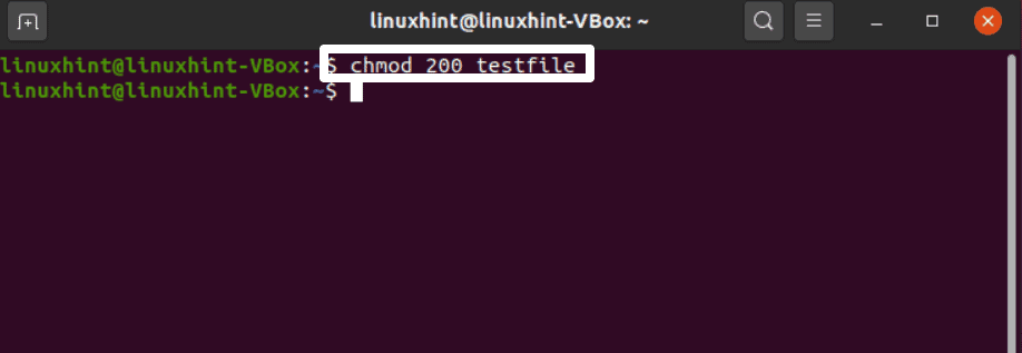 Muokkaamme tässä esimerkissä “TestFile” -tiedoston käyttöoikeuksia, jotta vain omistaja voi lukea sen. Mikään muu ryhmä tai käyttäjä ei ole pääsy lukemaan, kirjoittamaan tai suorittamaan tätä tiedostoa lukuun ottamatta tätä lupaa. Jopa tiedoston omistaja ei voi avata, muokata tai suorittaa tiedostoa. Tätä varten lisää ”0 -""ryhmät"Ja"toiset”Todit, jotka estävät näitä käyttäjiä vastaanottamasta oikeuksia ja käyttävät"4”Numeerisena esityksenä"vain luku-”Kolmen merkistöjoukon alussa: