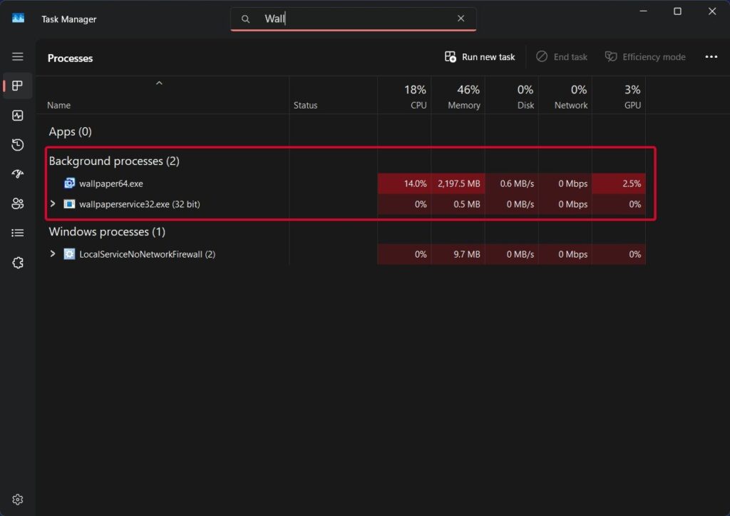 Kuten näette, Wallpaper Enginen käyttöaste on lähes 14 % CPU:sta ja nousee 25 %:iin, 2,2 Gt:n RAM-muistin käyttö kasvaa 3-4 Gt:iin ja 2,5 % GPU:n käyttöön vain kohtuullisen kokoisella taustakuvalla. Huomaa, että käytän Wallpaper Engineä kaikissa kolmessa 2K-näytössäni.