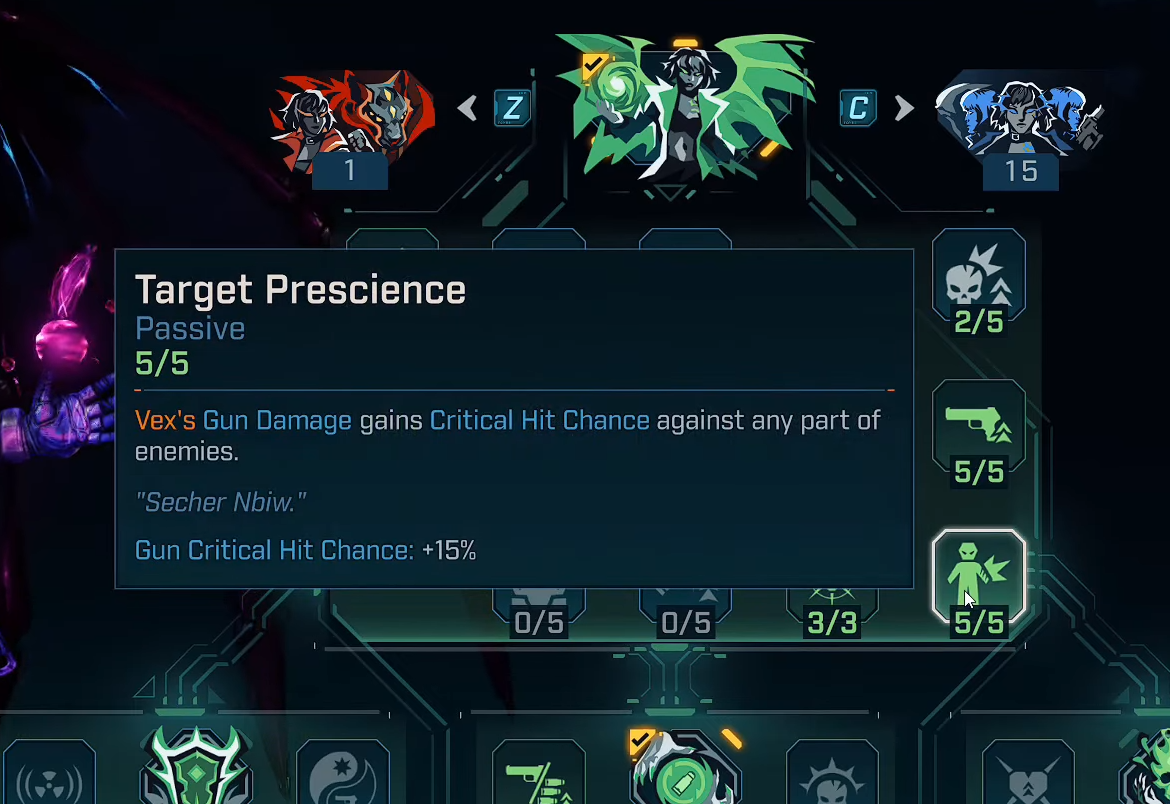 Tason 15 mukaan investoida kuolevaisen terrorin (vexcalation) kriittinen pinoamiseen-ei tarvetta täyttä tappaa, jos laskeudut pääkatsuihin. Lisää pisteitä Bloodletter -passiiviseen, mikä soveltaa vuotoa kritteihin (laskee asevaurioiksi). Lisäysten kohdalla kohde prescience Crit Chance -sovelluksen kohdalla, ruokinta äärettömiin silmukoihin.