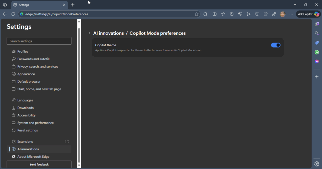 Tällä hetkellä se sisältää yhden vaihtoehdon nimeltäKopilottiteema, joka "soveltaa Copilot-inspiroimaa väriteemaa selainkehykseen, kun Copilot-tila on päällä."