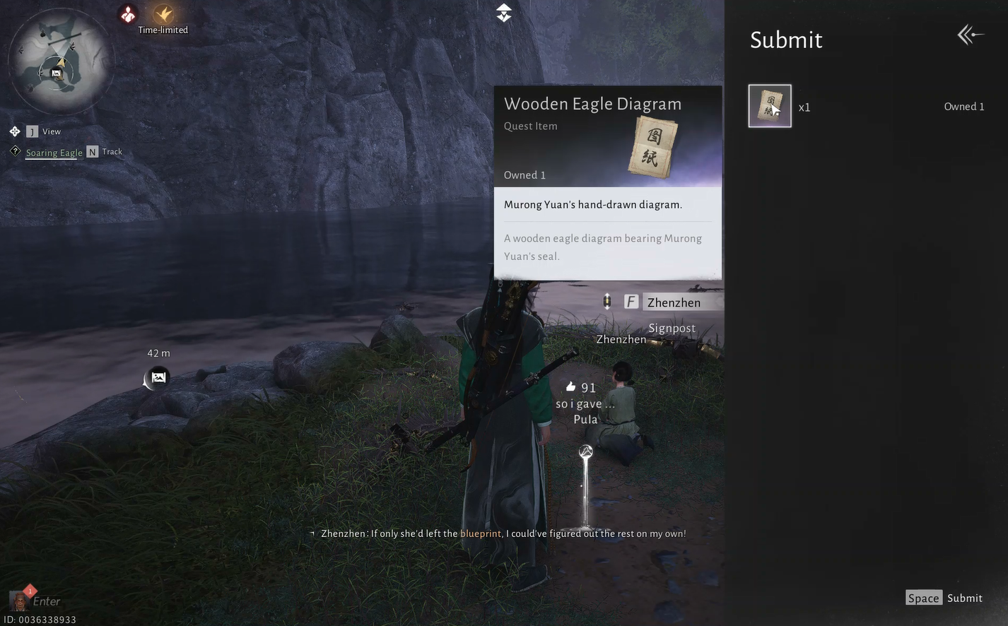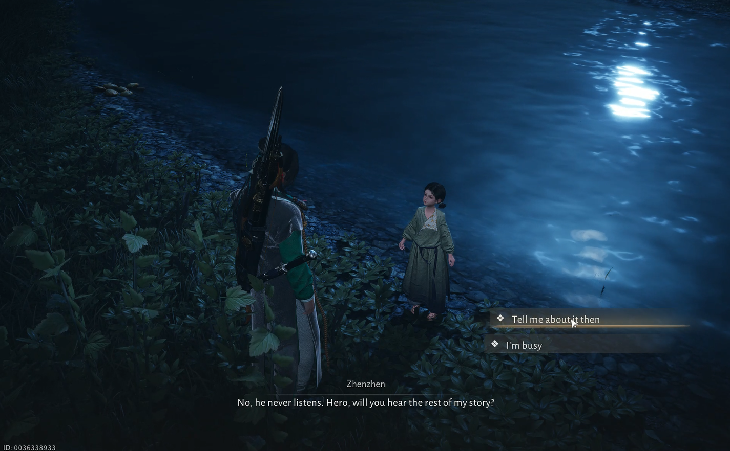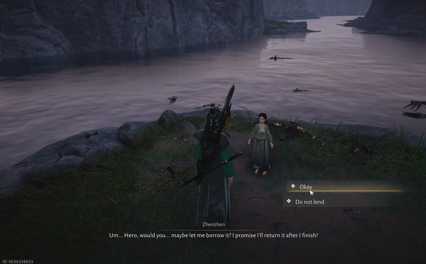 Kun todellinen päivä on kulunut, palaa Jade Mirror Pondiin. Löydät nyt pienen tytön nimeltä Zhenzhen lähellä joenrantaa. Lähesty häntä aloittaaksesi Soaring Eagle Encounter -tehtävän.