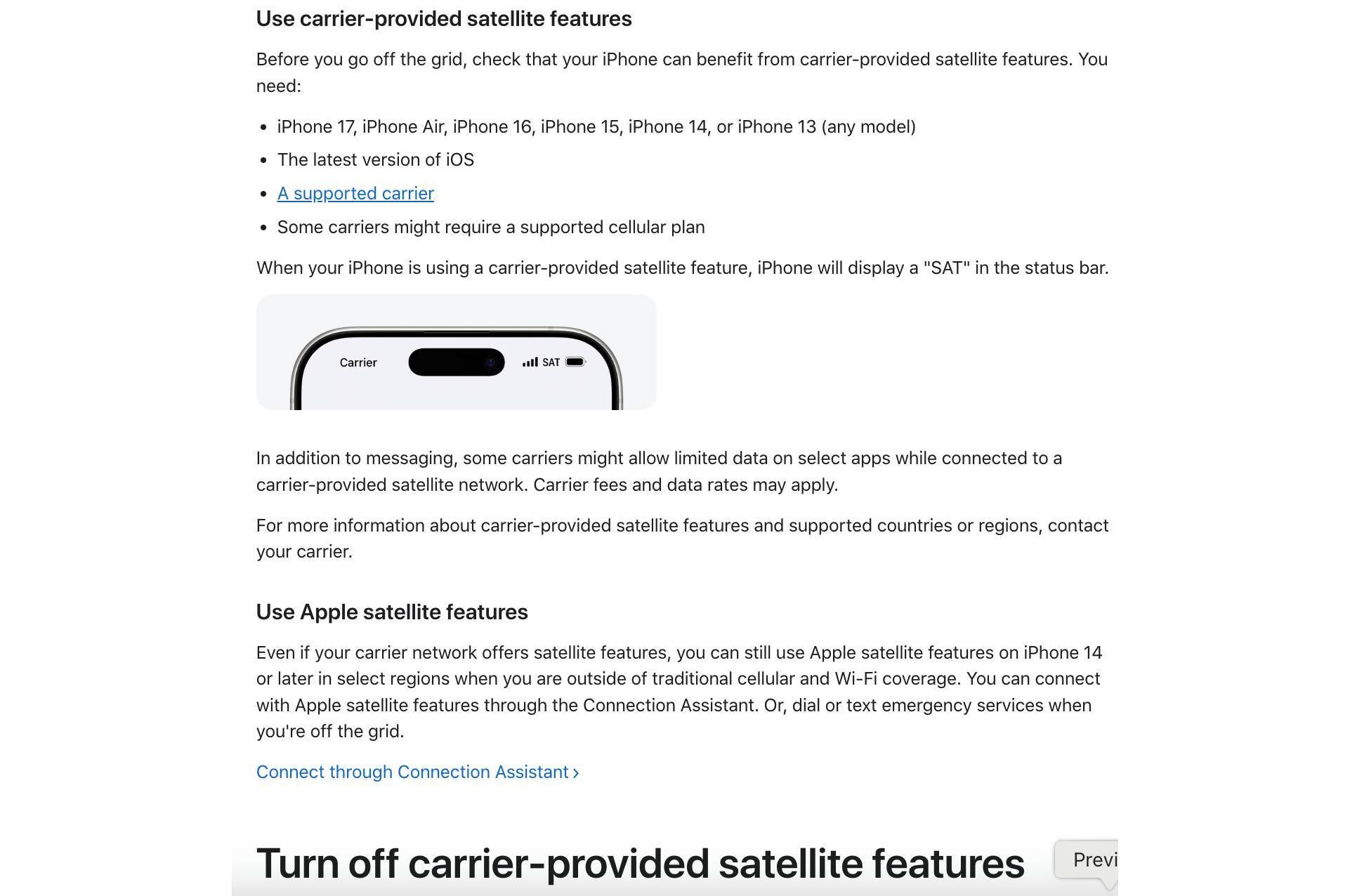 Yritysmuistuttaa käyttäjiäettä vaikka heidän teleyrityksensä tarjoaisi satelliittiominaisuuksia, he voivat silti käyttää sen sijaan iPhonen sisäänrakennetut satelliittiominaisuudet. Sen verkkosivusto on päivitetty ilmoittamaan käyttäjille, että operaattorin toimittamat satelliittiominaisuudet voidaan sammuttaa asetussovelluksessa.